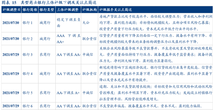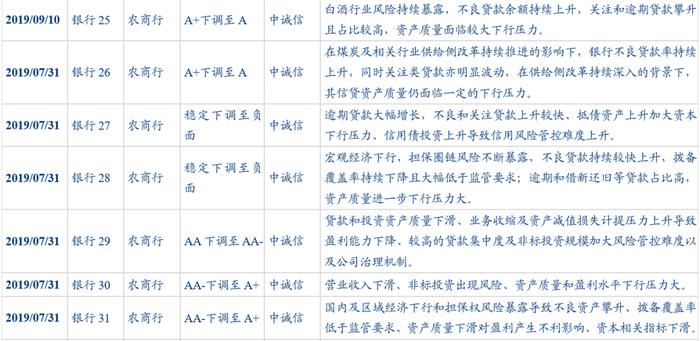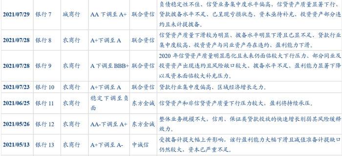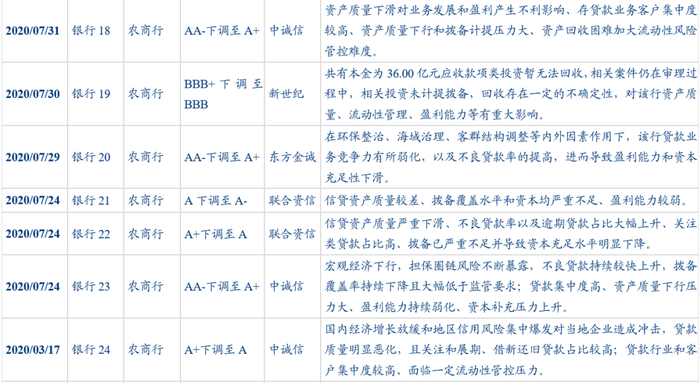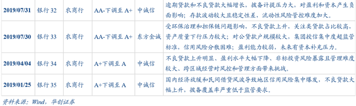 2019年以来,共有41家商业银行主体评级下调,主要为区域农商行。从评级报告关注点来看主要有以下四方面: