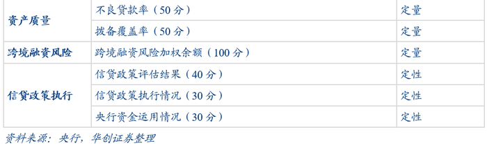 MPA评估的主管单位是央行货币政策司(负责执行具体评估工作)和宏观审慎管理局(负责政策框架制定),每季度评估一次,包含资本和杠杆情况、资产负债情况、流动性、定价行为、资产质量、跨境融资风险和信贷政策执行七大方面,总计16个细分指标,其中七大类指标每类满分均为100分,90分及以上为优秀,60-90分为达标,60分以下为不达标。