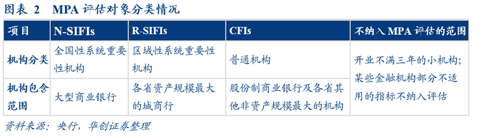 MPA评估对象包括商业银行、财务公司、金融租赁公司、汽车租赁公司、信托投资公司等银行业金融机构,主要针对银行,分为三大类:全国性系统重要性机构(N-SIFIs,一般指大型商业银行)、区域性系统重要性机构(R-SIFIs,一般指各省资产规模最大的城商行)和普通机构(CFIs,一般指股份制银行和各省其他非资产规模最大的机构)。