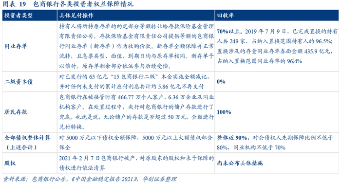 对于各类投资者而言,包商银行在风险处置过程中对各类债权(居民存款、同业存单、二级资本债等)以及股权投资者的权益保障情况有所差异。综合来看,债权回收率较高,整体近90%。其中居民存款无论是否超过50万元,均全额兑付,回收率为100%;同业存单可按先期保障比例转换为新存单,受人民银行、银保监会与存款保险基金全额保障,回收率大于先期保障比例;二级资本债“15包商银行二级”进行全额减记,回收率为0%。股权投资者则根据破产清算流程进行回收,尚未公布具体措施。