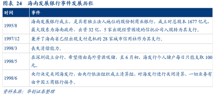 2、海南发展银行:1)背景沿革及发展历程:1995年8月,在5家信托投资公司的基础上改组成立海南发展银行;1997年,海南发展银行兼并受到房地产泡沫破灭波及的28家城市信用社;2)风险分析:行政干预的资产重组导致不良资产比例过大;风险控制薄弱,违法违规经营;股东争夺控制权,内控机制失灵;限息政策和储户恐慌心理导致挤兑潮。
