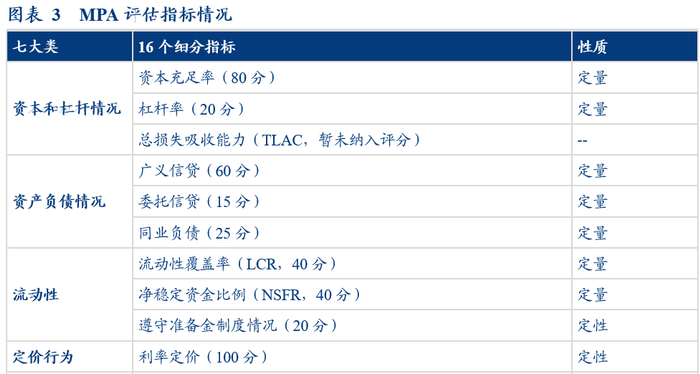 宏观审慎评估体系(MPA):央行2015年12月29日发文,2016年开始实施。MPA评估对象分为三大类:全国性系统重要性机构(N-SIFIs)、区域性系统重要性机构(R-SIFIs)和普通机构(CFIs)。MPA每季度评估一次,包含资本和杠杆情况、资产负债情况、流动性、定价行为、资产质量、跨境融资风险和信贷政策执行七大方面,总计16个细分指标。