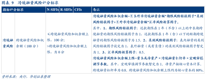 跨境融资风险有一项有效评估指标:跨境融资风险加权余额,反映商业银行跨国风险,符合要求为100分,超出上限为0分。
