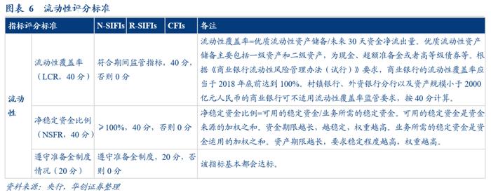 流动性有三项有效评估指标,其中流动性覆盖率(LCR)占40分,净稳定资金比例(NSFR)占40分,遵守准备金制度情况占20分。流动性覆盖率为优质流动性资产储备/未来30天资金净流出量,符合监管指标则为40分,否则为0分;净稳定资金比例=可用的稳定资金/业务所需的稳定资金,不低于100%则为40分,否则为0分。