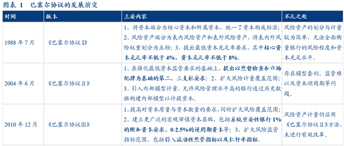 布雷顿森林体系解体后,全球稳定的汇率制度被瓦解,跨国银行风险不断积聚,大幅提高了全球金融市场的系统性风险,在此背景下,巴塞尔协议应运而生。巴塞尔协议旨在维持资本市场稳定、减少国际银行间的不公平竞争以及降低银行系统信用风险和市场风险等,是巴塞尔委员会制定的在全球范围内主要的银行资本和风险监管标准。