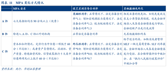 根据各项指标的评估结果,MPA评估体系将被评估机构分为A、B、C三档,A档机构七大类指标均需达到优秀,对其实施奖励性准备金利率和一些其他激励;C档机构资本和杠杆情况、定价行为两类中任意一项不达标,或者资产负债情况、流动性、资产质量、跨境融资风险、信贷政策执行5大类中任意两项及以上不达标,对其实施约束性准备金利率和一些其他约束;剩余为B档机构,对其实施正常的准备金利率,并无其他激励和约束。MPA按每季度数据进行事后评估,同时按月进行事中事后监测和引导,实施期间为当次评估结果生效后的3个自然月,待下次评估结果生效后重新调整。此外,考虑到新设机构缺乏评估所需历史数据,且往往初期发展较快,原则上开业三年内可暂不纳入MPA。