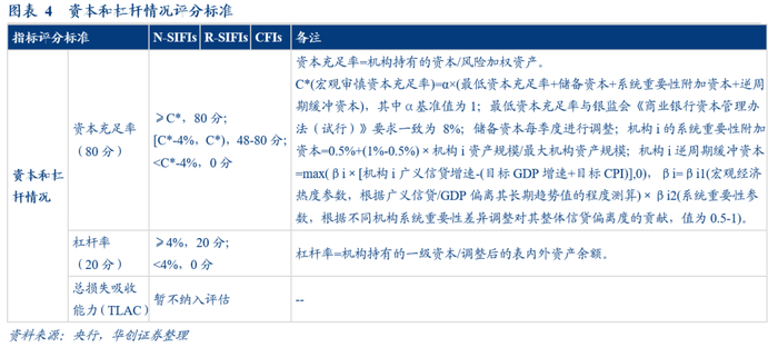 资本和杠杆情况有两项有效评估指标,其中资本充足率占80分,杠杆率占20分,若该大类指标不达标,直接进入C档。资本充足率反映商业银行在存款人和债权人的资产遭到损失之前,该银行能以自有资本承担损失的程度;杠杆率为资本充足率的有效补充,可避免加权风险资本充足率的复杂性问题,减少资本套利空间。该类指标越高,资本和杠杆情况评分越高。