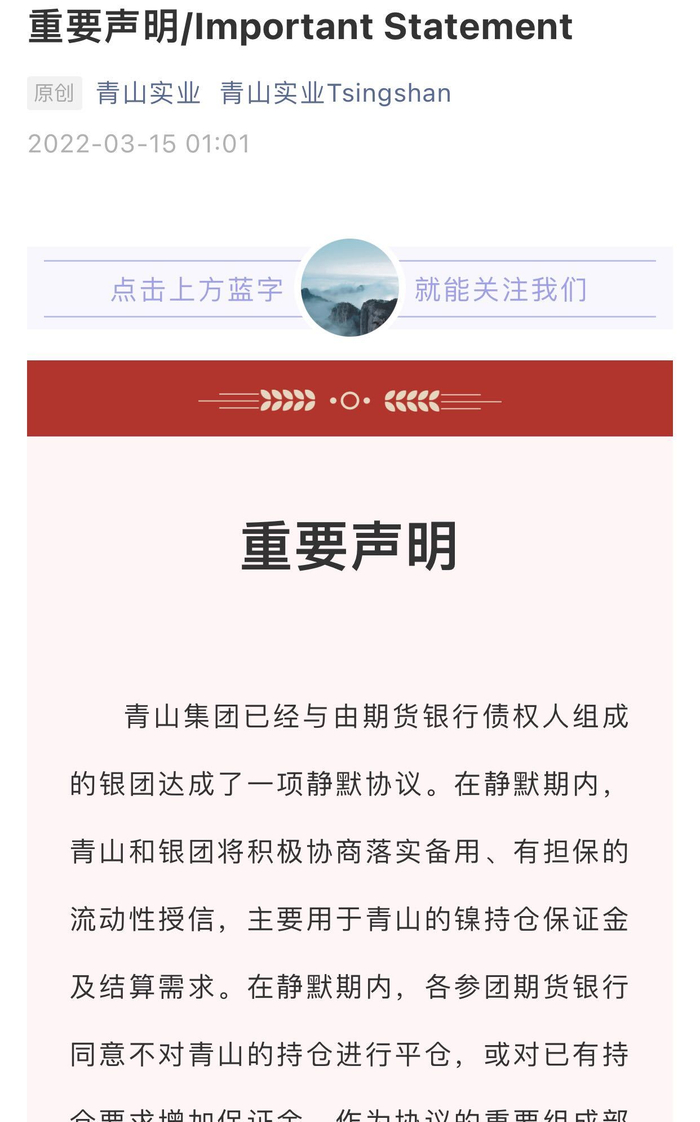 据“青山实业Tsingshan”微信号3月15日凌晨消息,青山实业发布重要声明,称青山集团已经与由期货银行债权人组成的银团达成了一项静默协议。在静默期内,青山和银团将积极协商落实备用、有担保的流动性授信,主要用于青山的镍持仓保证金及结算需求。在静默期内,各参团期货银行同意不对青山的持仓进行平仓,或对已有持仓要求增加保证金。作为协议的重要组成部分,青山集团应随着异常市场条件的消除,以合理有序的方式减少其现有持仓。