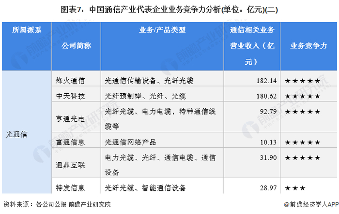 光通信行业,以光纤光缆市场为例,网络电信信息研究院发布的《2020年全球|中国光通信最具竞争力企业10强》数据显示,在全球光纤光缆榜单中,10强企业中中国企业占据半壁江,长飞以9.14%的市场份额排名全球第二,中天科技以8.28%的市场份额居于第三,亨通以7.94%的市场份额位居第四,富通以7.49%的市场份额排名第七,烽火通信以6.48%的市场份额排名第九。