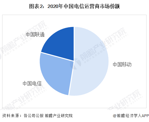 目前,中国电信运营行业三大龙头企业分别是中国移动、中国电信、中国联通,三大电信运营商处于寡头垄断的竞争格局;2020年,按营业收入计,三大运营商的市场份额占比分别为52.54%,26.67%和20.78%,中国移动独占中国电信运营市场的半壁江山。