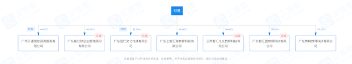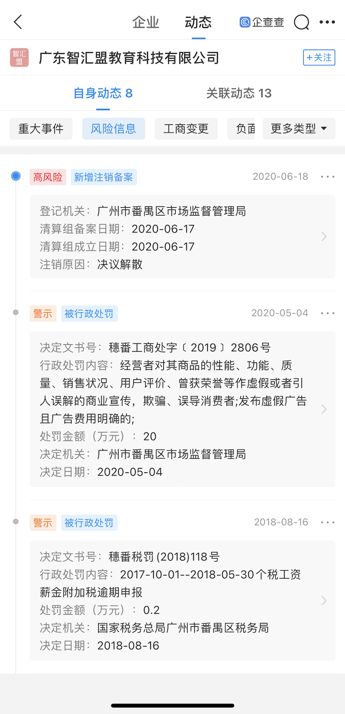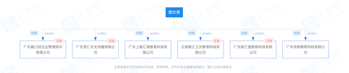 企查查信息显示,广东上智汇海教育科技有限公司持股60%的股东是邹女英,持股40%的股东是付昱。两人此前以同样股比持股的广东智汇盟教育科技有限公司已经被注销,该公司在注销前被广州市番禺区市场监督管理局予以20万元的处罚,处罚事由是“公平交易违法行为,广告违法行为”——2019年7月29日,广州市番禺区市场监督管理局法人员依法检查,发现当事人在经营场所张挂“智汇盟发展历程”的宣传海报中有“2018年3月一周年,达成10万学员,平台估值4亿2018年12月全球股交挂牌,启动上市战略2019年3月两周年,平台达成24万学员,平台估值15亿”等字样宣传海报的行为,违反《中华人民共和国广告法》相关规定。