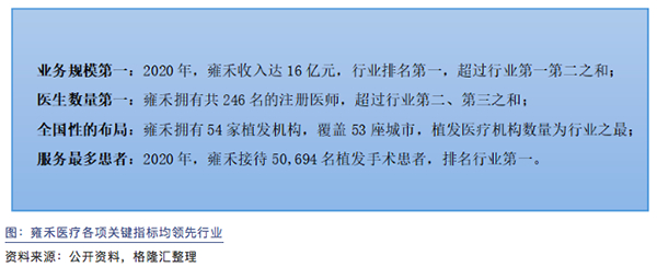 雍禾医疗作为领域内最早期的入局者之一,先发优势显著。按照2020年营业收入计算,雍禾医疗以14.13%的市场份额位居行业第一,超过行业第二、第三名竞争者之和;此外,雍禾医疗在医生数量、植发医疗机构数量以及植发患者人数这三项关键指标均位列中国植发行业第一。