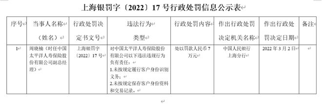此外,时任太保寿险副总经理的崔顺心、周晓楠也因对未按规定履行客户身份识别义务、未按规定保存客户身份资料和交易记录两项违法违规行为负有责任,各被罚款7万元。