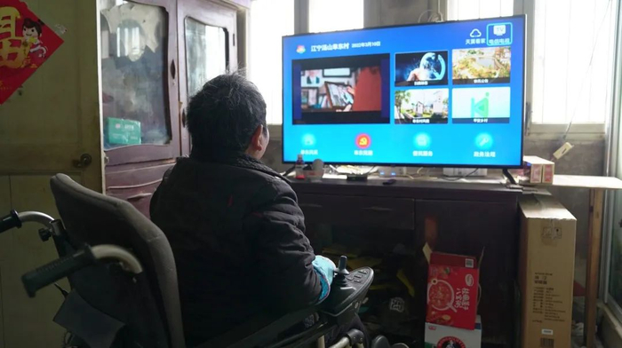 66岁的独居老人侯金元一边用手机查看着家中的门户安全,一边打开电视查看最新的乡村活动;