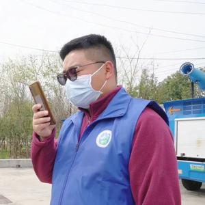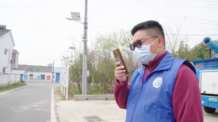 村间的乡村小路上,网格员雷梦伟一边巡村一边用“云喇叭”将防疫须知播报出去;