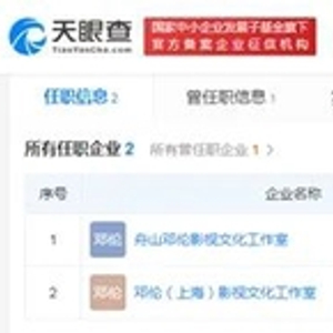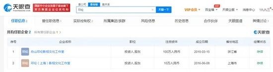 天眼查显示,邓伦名下有两家公司,分别为邓伦(上海)影视文化工作室和舟山邓伦影视文化工作室。邓伦对其都是100%持股。分别成立于2016年和2018年。