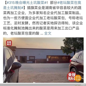 “老坛酸菜”登上“315”晚会,康师傅、统一的老坛酸菜面你还敢吃吗?3月15日,央视“315”晚会曝光康师傅、统一等企业老坛酸菜供应商湖南插旗菜业有限公司(以下简称“插旗菜业”)及湖南锦瑞食品有限公司(以下简称“锦瑞食品”)存在卫生不达标、生产无保