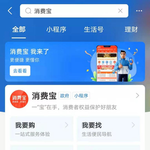 “消费宝”场景,是为消费者提供一站式购物、维权、参与等服务的平台。以“更便捷、更懂你”为服务宗旨,致力于成为消费者的“生活掌中宝”。