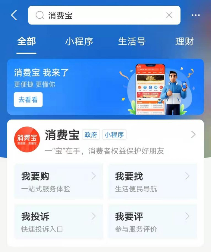 用户打开支付宝,搜索“消费宝”,即可体验各种功能。“消费宝”为消费者提供从资讯,到导购,到维权的全链条消费体验场景服务。