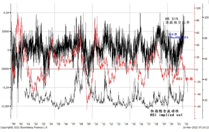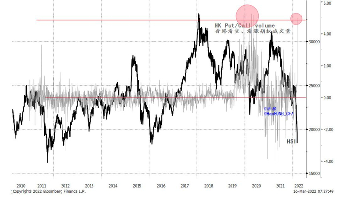 Our report titled “The Ides of March” this Monday (2022-03-15) alerted an impending dramatic selloff. Right now, record short volume and put buying suggest extreme pessimism and market capitulation, but technical reprieve tends to follow, fleeting or not. Such extreme cautionary trades for insurance purpose tends to be fuel for violent short covering rallies later. With the Fed’s first hike in sight since its epic easing, the HKMA’s move will be better understood and should help improve market uncertainty.