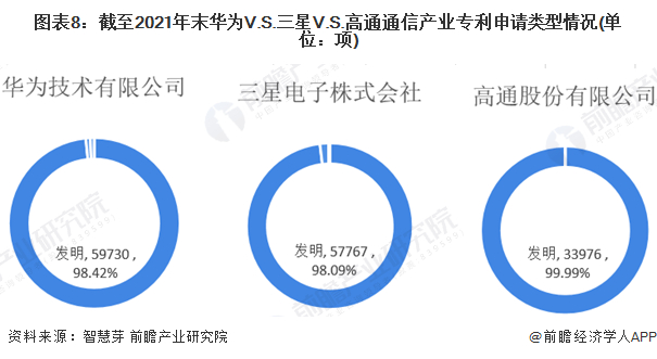 截至2021年末,华为、三星和高通的通信产业专利申请类型均以发明专利为主。其中,高通的通信产业专利基本全部为发明专利(仅有3项为外观设计专利)。