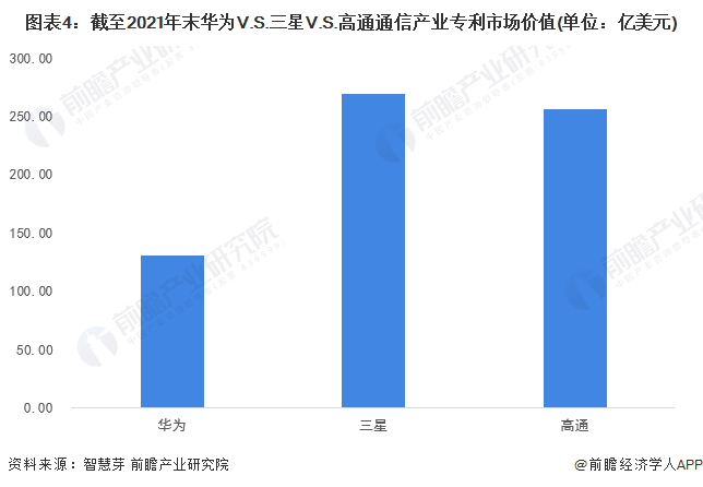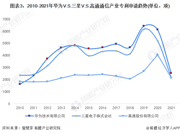 截至2021年末,在通信产业专利申请总量方面,华为的通信产业专利申请总量多于三星,并且是高通通信产业专利申请量的近2倍;华为、三星和高通的通信产业专利申请总量分别为60690项、58889项和33979项。