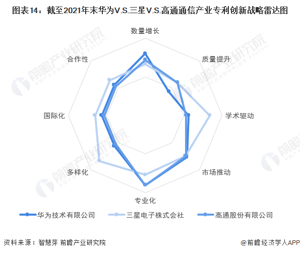 整体来看,三星和高通的通信产业技术在数量增长和专业化方面具有相对竞争优势华为的通信产业技术则在学术驱动、多样化、国际化和合作性方面具有相对竞争优势。三者通信产业技术在质量提升和市场推动方面实力相当。
