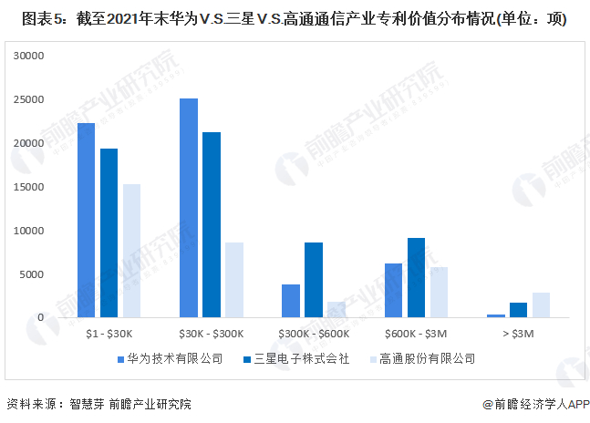 三星通信产业专利总价值最高,为269.50亿美元,是华为的2倍多,高通的通信产业专利总价值与三星基本持平。在专利价值分布方面,三家公司的大多数通信产业专利价值主要集中在3万-30万美元。