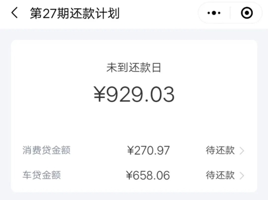 该用户称,2019年11月份其在微众银行贷款2万元用于买车,彼时业务员称“贷款2万元,分36期还款,一个月才几百元,没多少钱。”但后期该用户查看合同贷款时发现,其总共在微众银行申请了2笔贷款,一笔为2.1万元汽车贷款,还有一笔8647元的消费贷款。两笔贷款均是分36期偿还,其中汽车贷款月还款金额为658.06元,消费贷月还款金额为270.97元。每期还款金额合计929.03元。“说是借2万元买车,三年后要还33480元,这分明是高利贷了。”
