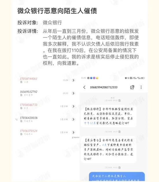 记者梳理发现,直到目前,仍有消费者投诉表示,自己无故长期遭受来自微众银行的电话催收。一位消费者表示,从2022年年后一直到三月份,微众银行持续向其发送一个陌生人的催债信息,期间还有催收电话“轰炸”。该消费者多次向催收人员解释,自己并不认识这名债务人,但并无效果。今年3月初,该消费者不堪其扰,选择拨打110向公安局报案。该消费者诉求微众银行停止相关催收行为并进行道歉。