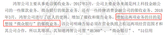 成都市武侯区人民法院披露的《陈莉、程鹏辉、李昱臻等侵犯公民个人信息罪一审刑事判决书》显示,鸿智公司成立后,接受微众公司等金融机构的委托开展电话催收业务。