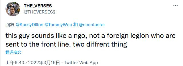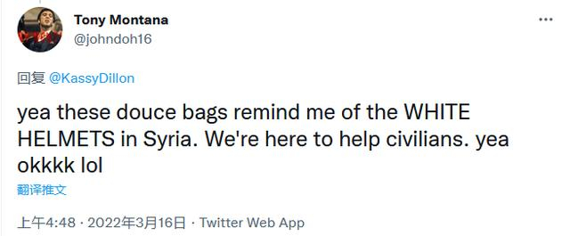 不过仍有很多推特网友对Kassy Dillon言论的真实性表示怀疑,“这家伙听起来像是个NGO,而不是被派往前线的外国军团”、“这些混蛋让我想起了叙利亚的白头盔,我们是来帮助平民的,呵呵”。
