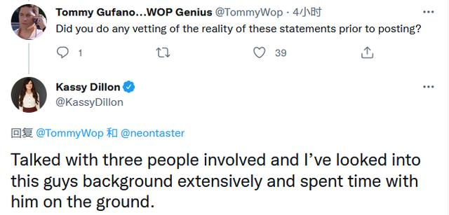 有人询问Kassy Dillon“在发布这则声明前是否做过事实核查”,后者坚称信源可靠,“我与三位相关人士进行了交流,广泛调查了这名男子的背景,并与他接触过一段时间。”