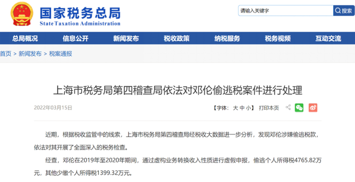 3月15日,国家税务总局发布消息称,近期,根据税收监管中的线索,上海市税务局第四稽查局经税收大数据进一步分析,发现演员邓伦涉嫌偷逃税款,依法对其开展了全面深入的税务检查。