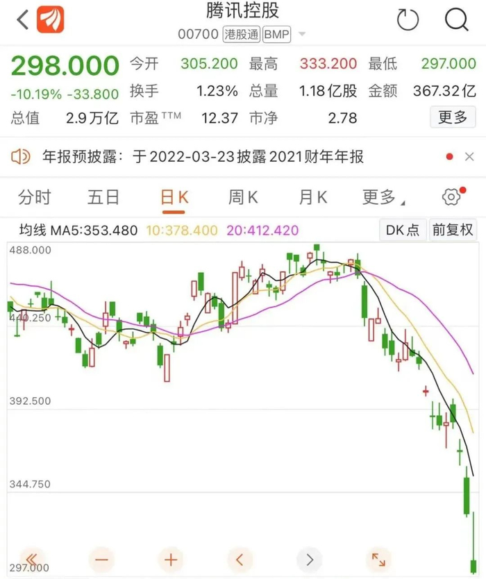 近2日,腾讯股价连续遭遇大跌,2日累计跌幅接近19%,年内跌幅已高达32.8%,这在腾讯历史上是非常罕见的,其最新总市值已跌至2.86万亿港元。