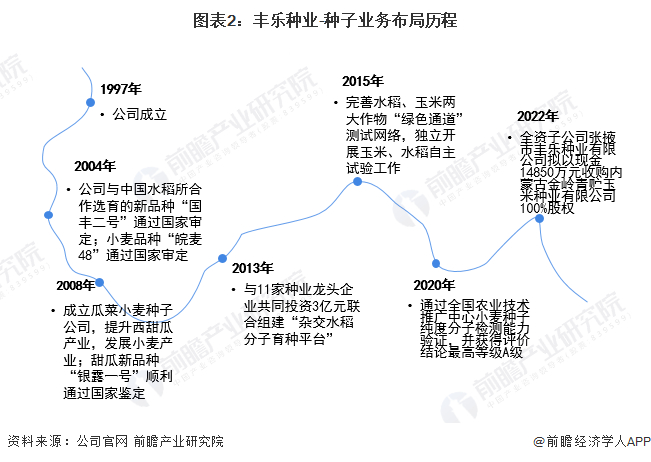 1997年,丰乐种业成立;2004年,公司与中国水稻所合作选育的新品种“国丰二号”通过国家审定;小麦品种“皖麦48”通过国家审定;2008年,公司成立瓜菜小麦种子公司,提升西甜瓜产业,发展小麦产业;甜瓜新品种“银露一号”顺利通过国家鉴定;2013年,公司与11家种业龙头企业共同投资3亿元联合组建“杂交水稻分子育种平台”;2015年,公司完善水稻、玉米两大作物“绿色通道”测试网络,独立开展玉米、水稻自主试验工作;2020年,公司通过全国农业技术推广中心小麦种子纯度分子检测能力验证;2022年,全资子公司张掖市丰乐种业有限公司拟以现金 14850万元收购内蒙古金岭青贮玉米种业有限公司100%股权,旨在丰富公司种业品种结构。
