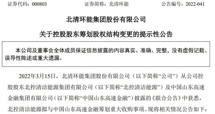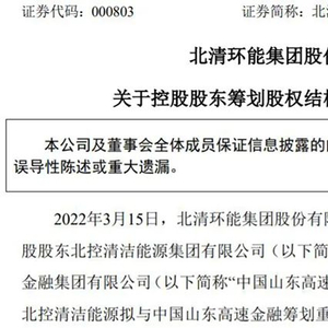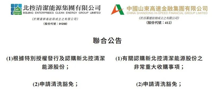 3月15日晚间,北清环能公告称,公司控股股东北控清洁能源集团与山高金融,当日均在港交所披露《联合公告》要筹划重大收购事项。