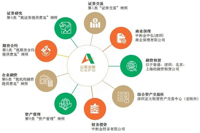 山高金融现持有香港证监会1、4、5、6、9号牌照和香港放债人牌照,可从事证券交易、分析与承销、财务顾问、资产管理、证券投资以及信贷等业务;持有境内QFLP、融资租赁、保理和金融资产交易平台等牌照,可从事资产管理、金融资产撮合交易业务、融资租赁和保理等债权类业务以及股权类投资业务。