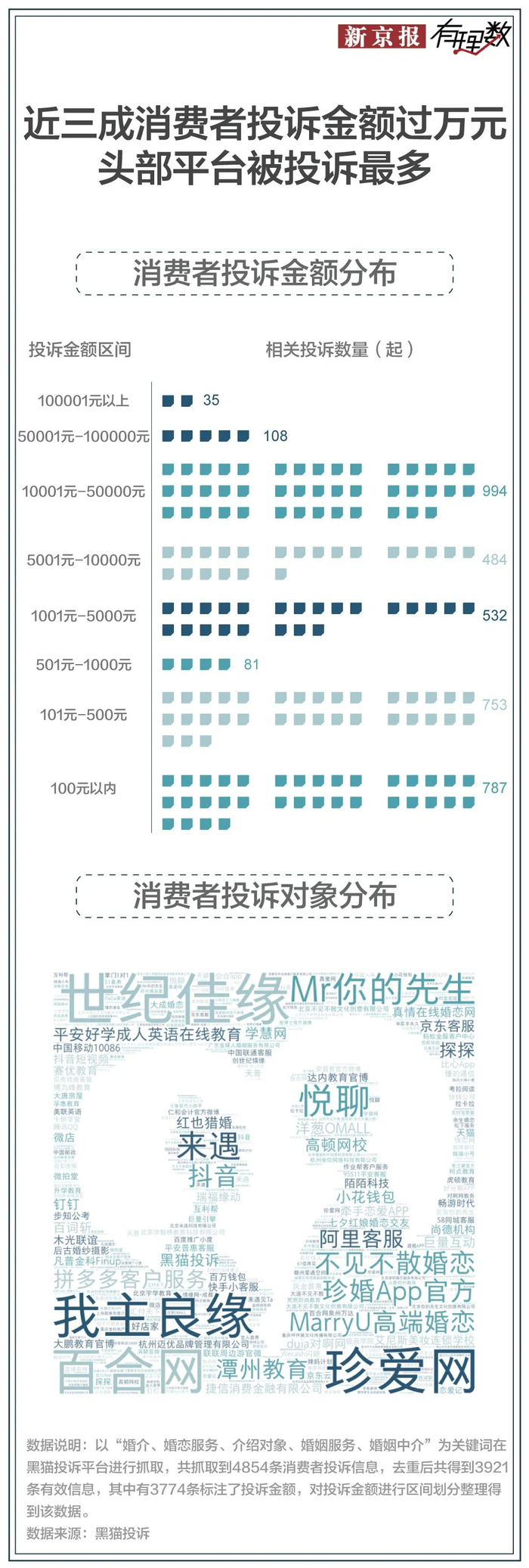 从消费者的投诉金额看,婚介服务费并不低,价格区间分布在1万到5万元的最多。