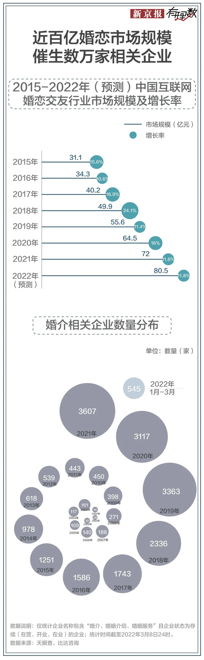 数据显示,中国现存2.2万家婚介相关企业,2021年注册量达到3600余家,较20年前数据增长约10倍,2022年前3个月新注册企业就有545家。