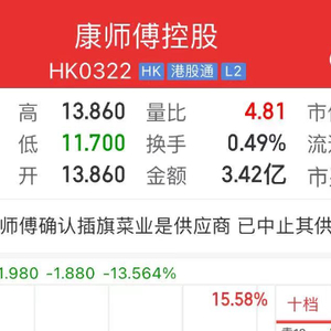 央视3·15晚会曝光了湖南插旗菜业等使用生产环境露天、卫生条件较差的酸菜加工老坛酸菜产品,并涉及康师傅等国内多家食品企业。今日开盘后,康师傅控股和统一企业中国股价快速下跌,跌幅一度跌超过5%。在业内看来,酸菜乱象事件可能会对方便面企业的销售带来很大影响,对餐饮行业的后续影响还很难估量。