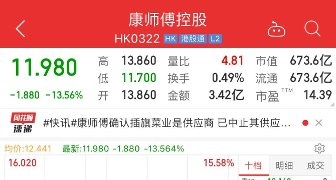 不过3月16日开盘后,上述两家方便面企业的股价都大幅下跌,截至记者发稿时,康师傅控股下跌13.56%,统一企业中国股价下跌3.57%。