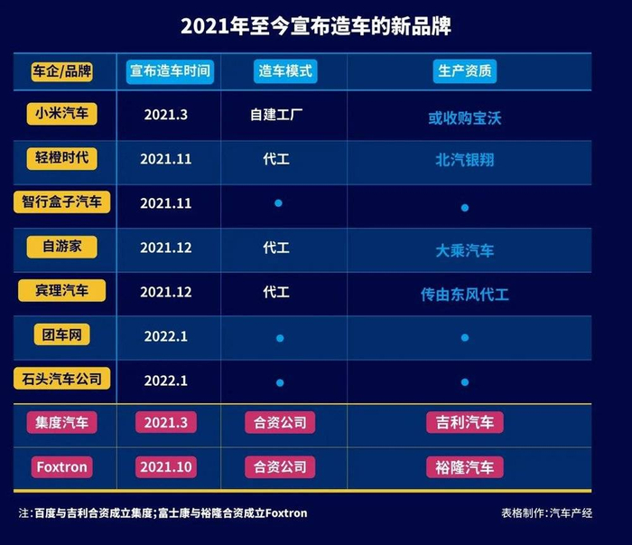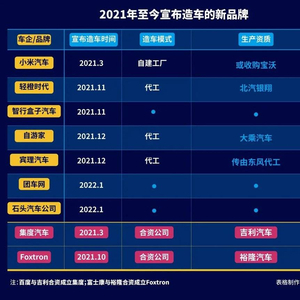 汽车产经将2021年以来宣布造车的新品牌做了不完全统计,发现9家中仅小米汽车确定通过北京顺义自建工厂入局造车。针对其生产资质的获取,坊间有两种说法,一种是小米通过收购宝沃取得;另一种是依靠北京市政府来申请。