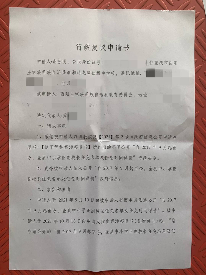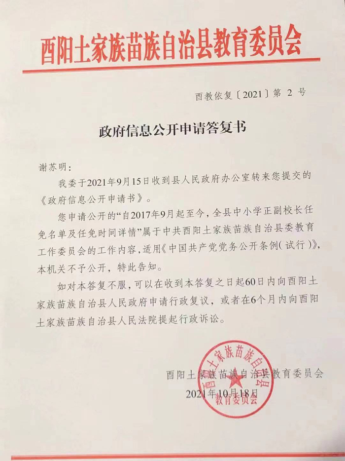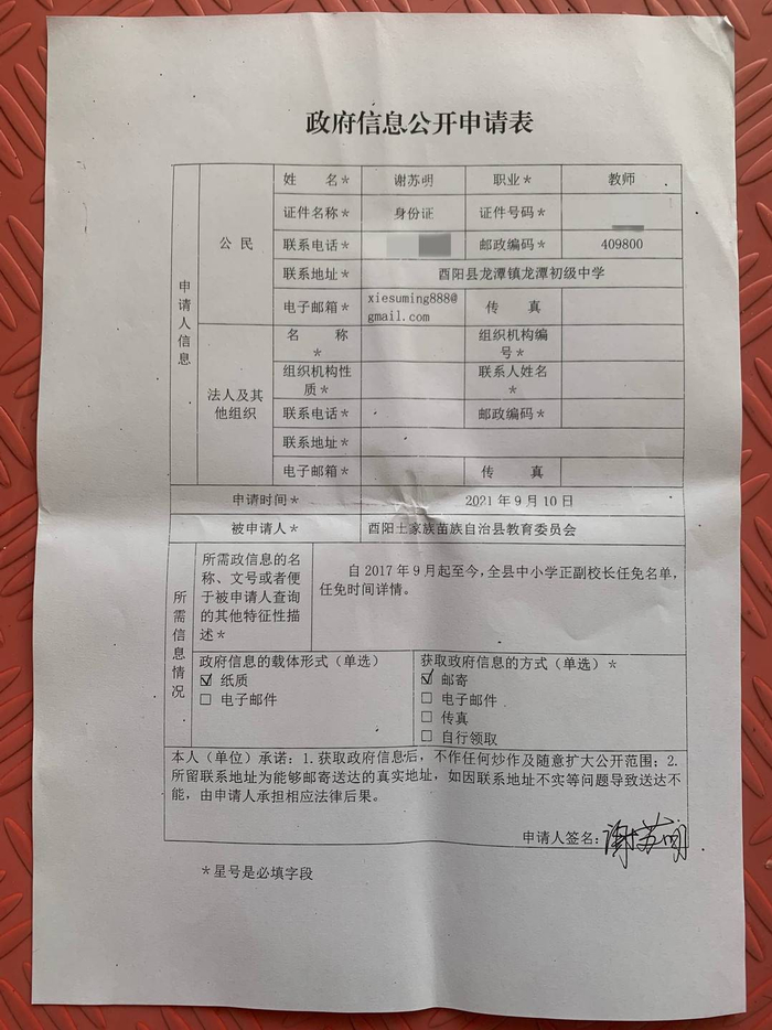 据谢苏明介绍,2021年9月,他向酉阳县人民政府提交了一份“政府信息公开申请表”,申请酉阳县教委提供自2017年9月起至今,全县中小学正副校长任免名单及任免时间详情。