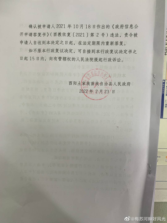 2月23日,酉阳县人民政府就此事下发行政复议决定书。决定书指出:在本案中,酉阳县教委的“答复书”以《中国共产党党务公开条例(试行)》作为申请人申请事项的定性依据,并未引用具体法律条款说明不予公开的理由,应视为适用法律错误。