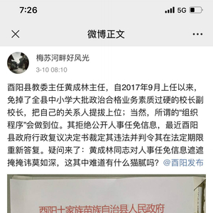 “酉阳教育系统里大家都害怕他,有的校长被撤换后还不敢说什么,但我不怕他。”谢苏明表示,“我想通过合法的途径向县教委要一份公开的人事任免名单,了解任免的流程是否合理、合法、合规。”