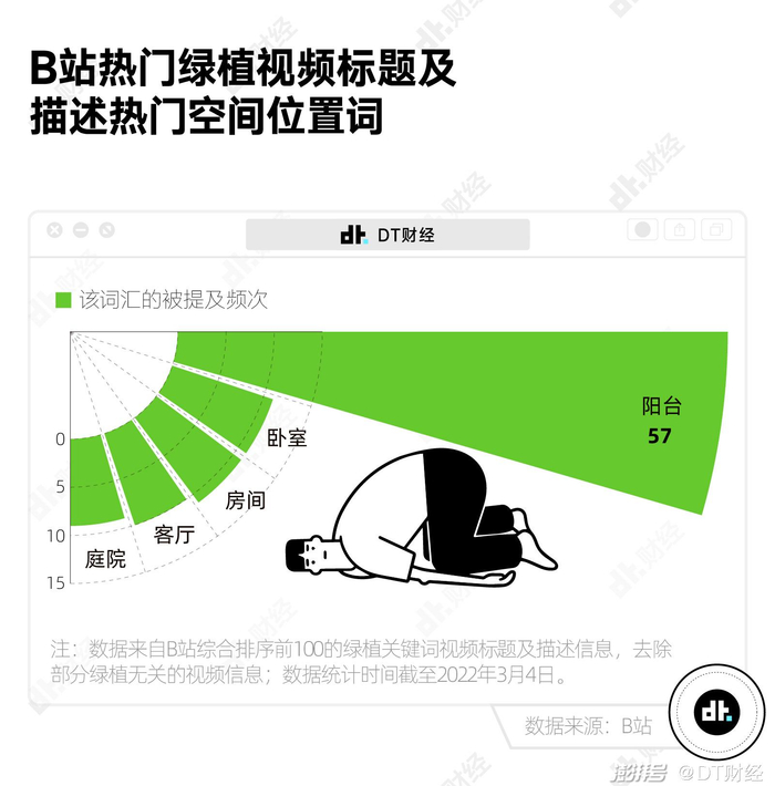 由于不少绿植都需要充足的阳光,所以阳台是大家放置绿植最常见的场所。从B站热门绿植视频来看,阳台是排名第1的空间位置词。
