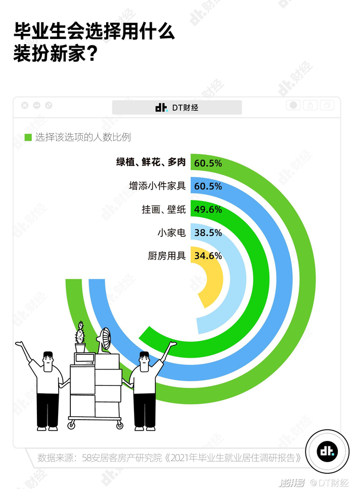 在装扮新家时,“绿植、鲜花、多肉”也是年轻人的首选。《2021年毕业生就业居住调研报告》表明,在准备搬入新居时,年轻人选择用“绿植、鲜花、多肉”装扮新家的比例与选择“增添小件家具”的比例比肩,甚至超过了购买小家电、厨房用具等实用的家居用品。