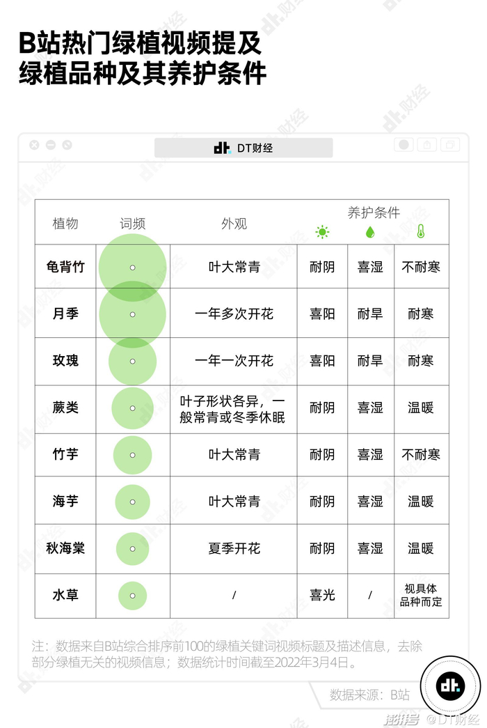 追求居家美学的年轻人,都在买什么样的植物?我们搜集了B站绿植主题视频提及的绿植品种信息。