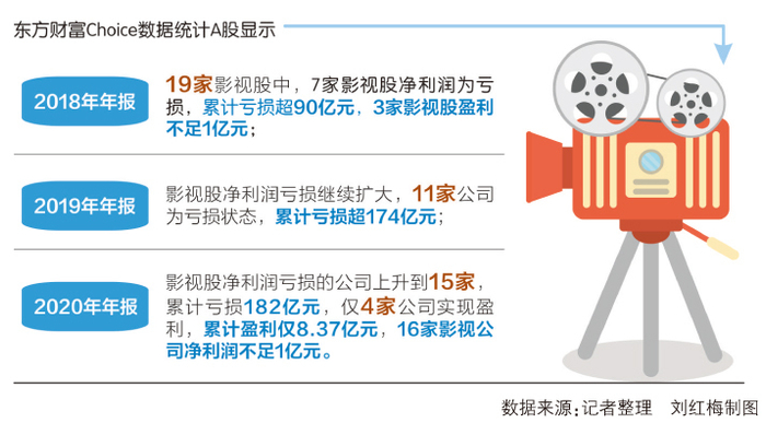 东方财富Choice数据统计A股显示,2018年年报,19家影视股中,7家影视股净利润为亏损,累计亏损超90亿元,3家影视股盈利不足1亿元;2019年年报,影视股净利润亏损继续扩大,11家公司为亏损状态,累计亏损超174亿元;2020年年报,影视股净利润亏损的公司上升到15家,累计亏损182亿元,仅4家公司实现盈利,累计盈利仅8.37亿元,16家影视公司净利润不足1亿元。